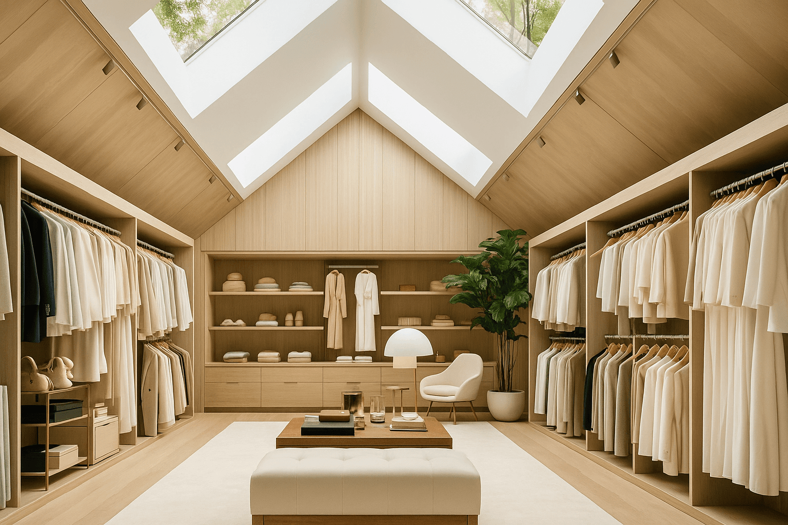 Inside, an open-concept layout connects the living, dining, and kitchen areas, all bathed in natural light from floor-to-ceiling windows. The interiors feature vaulted ceilings, smooth stone floors, and elegant minimal finishes that create a calm, airy atmosphere.